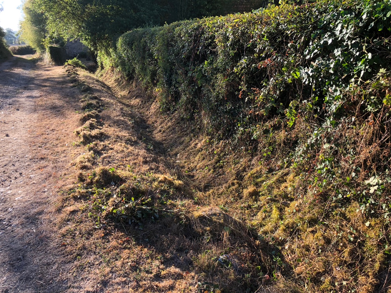 Hier zie je de greppel uitgemaaid. Bestaat vooral uit gras, inheemse planten en opschot van struiken. Soms kom je een steen tegen. Iets dat niet zo vreemd is want de bodem zit vol met stenen en zo af en toe komt er een boven. Voordat je het uitharkt, snoei je de haag ook gelijk zodat je al het maaisel in één keer mee neemt. Je harkt het op een rug op de rand zodat je het later weer bijeen kan harken en op de aanhanger kan gooien. Of afvoeren met een kruiwagen.