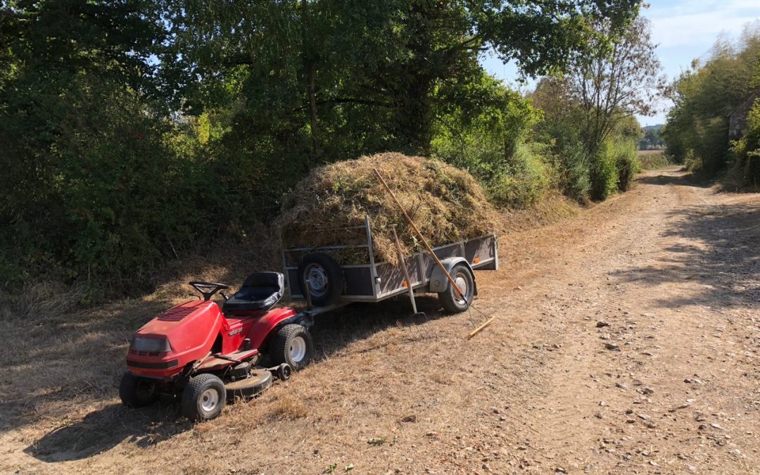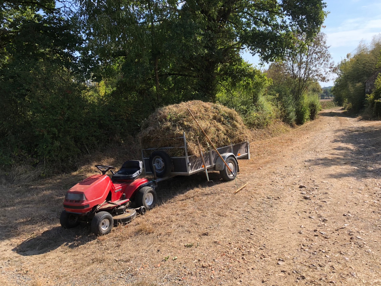 Je ziet hier alle maaisel en snoeisel op de aanhanger liggen. Die heb ik voor het gemak achter de zitmaaier gehangen. Daarna heb ik er een dekzeil over gedaan en met een touw goed vastgezet. Dit hebben we bij de dechetterie gebracht. Hier kun je al je groenafval en ook ander grof vuil brengen. Een pasje hiervoor haal je bij de gemeente.