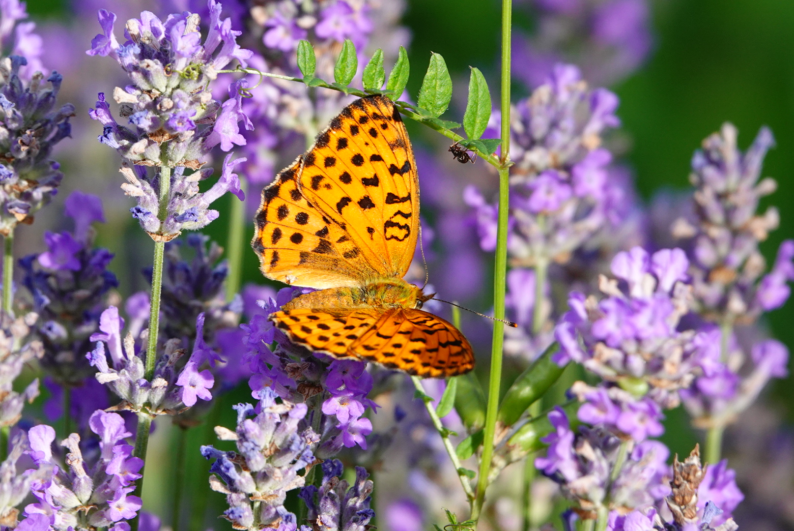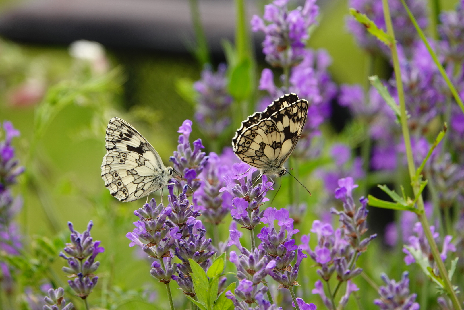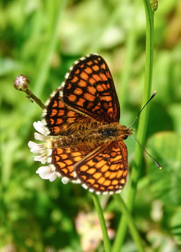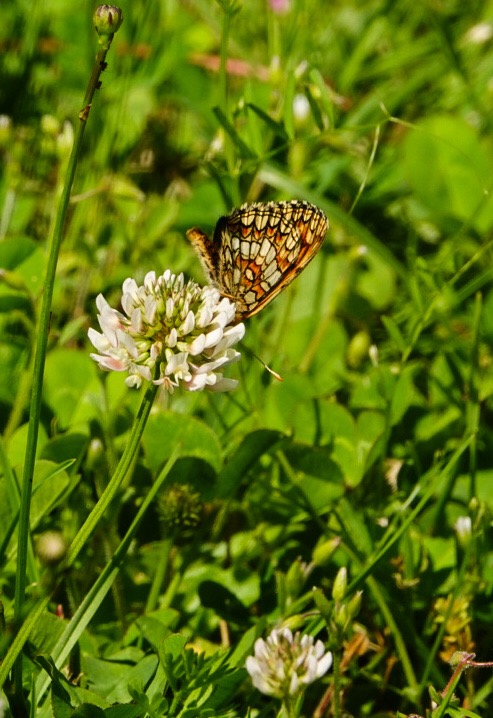 Braamparelmoervlinder op Lavendel, Kolibrievlinder op Lavendel, Kleine Vuurvlinder op Margriet, Zwartsprietdikkopje op Lavendel, Moerasparelmoervlinder op Witte Klaver, Dambordje op Lavendel, Groot Geaderd Witje op Rode Spoorbloem, Bruine Daguil op Lavendel, Bosparelmoervlinder op Witte Klaver en op Margriet, Dambordjes (m + vr) op Lavendel.
