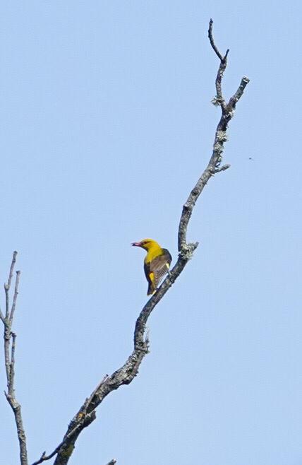 Al snel werd de roep van de Wielewaal hoorbaar. Wat een genot! Een wat melancholische roep. Het zijn er drie. De pul leert vliegen.