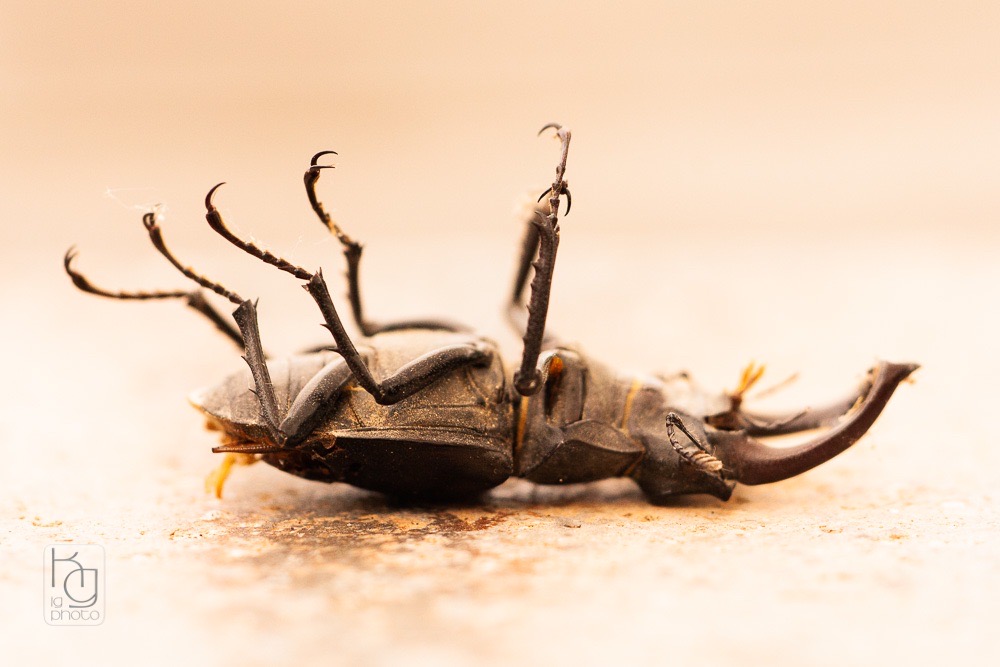 Celui-ci ne mesurait que 3 cm et n’était pas encore arrivé à maturité. Nous l’avons trouvé dans la buanderie où nous entreposons également les chaises en osier de la terrasse. La mort ! Après l’avoir admiré, il était temps de prendre une photo. Le sous-sol a cherché et pris quelques photos macro. La netteté est évidemment importante pour un si beau coléoptère. Il reste immobile lorsqu’il est mort, ce qui est un avantage. Il ne s’agit donc pas non plus de l’enregistrement d’un cerf volant, mais d’une sorte de nature morte. Enfin, il s’immobilise et l’astuce consiste alors à capturer correctement la beauté de votre objet. En utilisant Lightroom et quelques préréglages, j’ai pu créer cette atmosphère.
