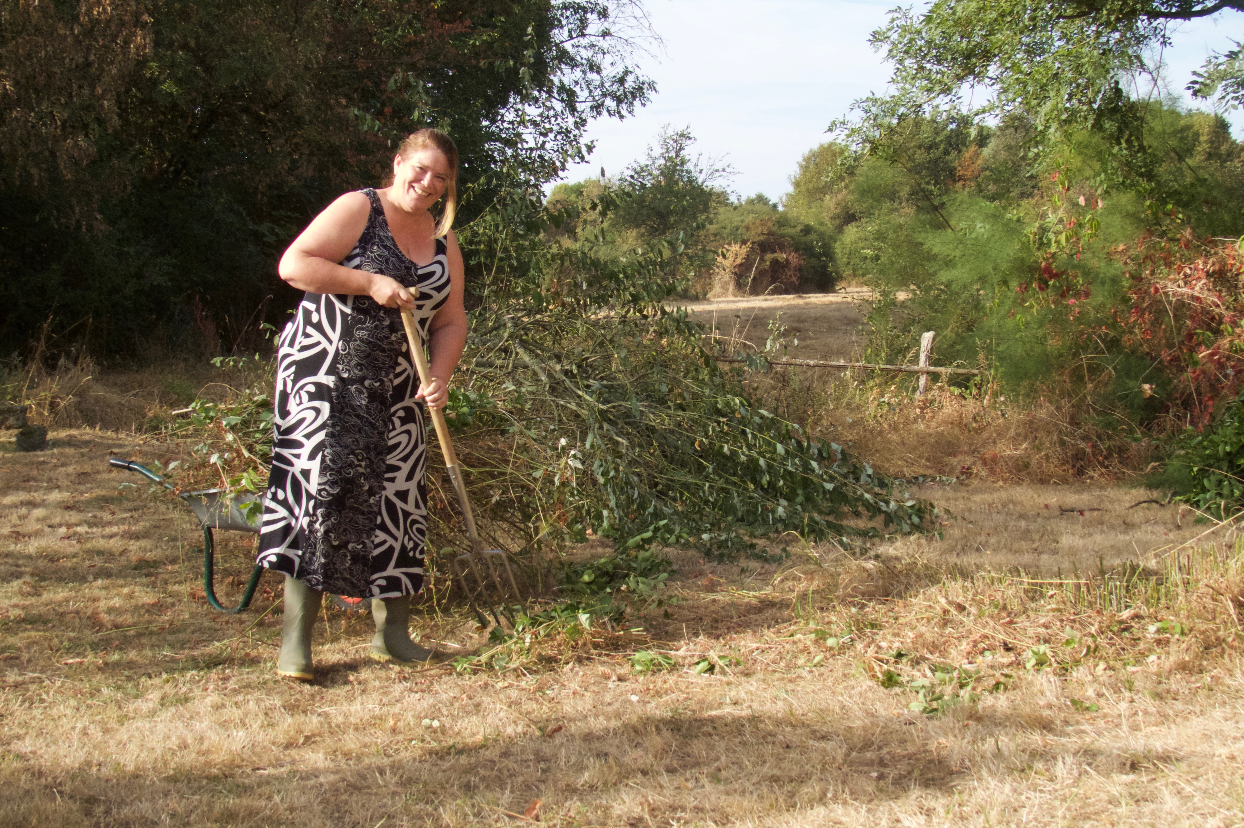 Maar goed, snoei levert veel takken op en die moeten verwerkt. Florien is hier bezig met het wegwerken van de gesnoeide takken. Wij hebben geen hakkelaar maar wel een groot gat in de tuin dat ooit de bedoeling had om zwembad te worden. Dat is er niet gekomen maar het was ondertussen al wel een vijver aan het worden, compleet met wilgen, sigaren en biezen. Dat gat gooien we dicht met snoeiafval, takken, grasmaaisel etc. Dan komt er nog een keer een laag grond over en is het weer gedicht. Het scheelt veel lopen en afvoeren naar de dechetterie, het franse locale afvalverwerkingstation.